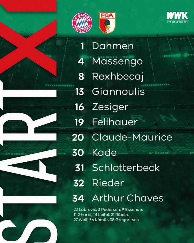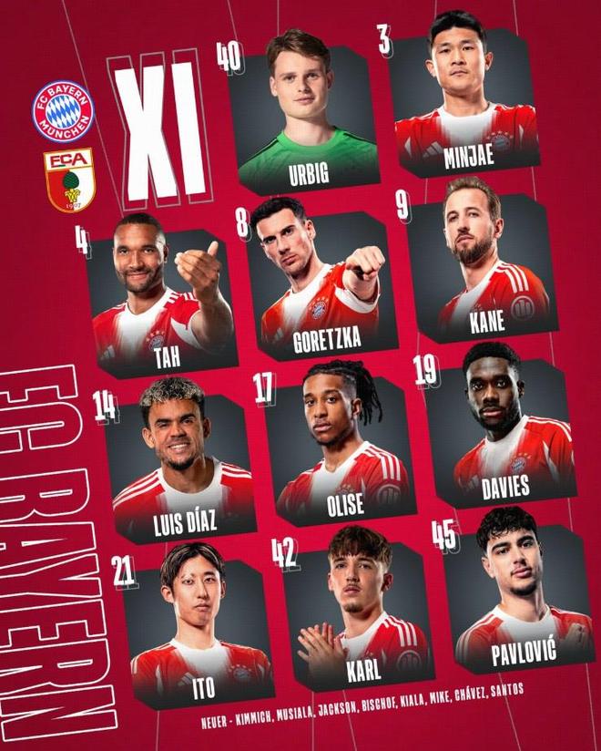 替補(bǔ):1-諾伊爾、6-基米希、10-穆西亞拉、11-雅克松、20-比朔夫、30-基亞拉、36-邁克、38-查韋斯、47-戴伯爾
