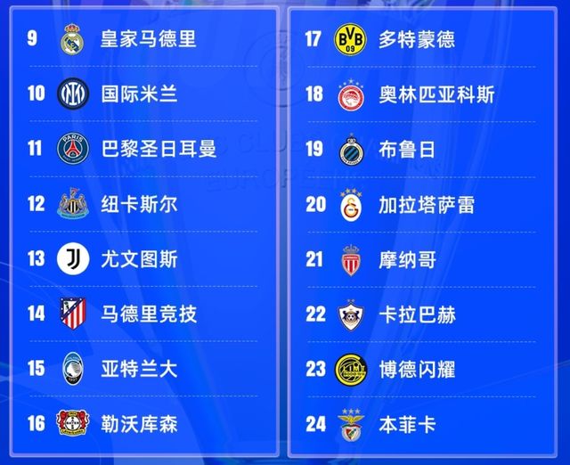 也就是說(shuō)按著比賽成績(jī)來(lái)分,目前只存在四組比賽對(duì)陣,分別是摩納哥、卡拉巴赫對(duì)巴黎圣日耳曼、紐卡斯?fàn)?,布魯日、加拉塔薩雷對(duì)尤文圖斯、馬德里競(jìng)技,博德閃耀、本菲卡對(duì)皇馬、國(guó)米,多特蒙德、奧林匹亞科斯對(duì)亞特蘭大、勒沃庫(kù)森。